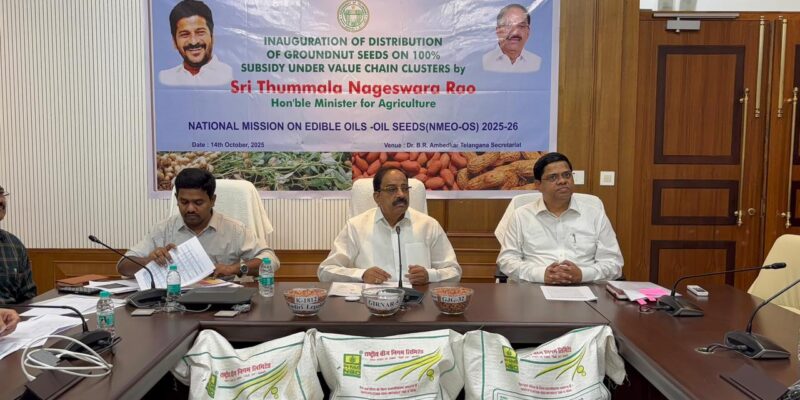 వ్యవసాయ, మార్కెటింగ్, సహకార, హ్యాండ్లూమ్ & టెక్స్టైల్ శాఖ మంత్రి శ్రీ తుమ్మల నాగేశ్వరరావు గారు, “నేషనల్ మిషన్ ఆన్ ఎడిబుల్ ఆయిల్స్ – ఆయిల్ సీడ్స్ (NMEO-OS) 2025-26” కార్యక్రమం కింద వేల్యూ చైన్ క్లస్టర్ల ద్వారా రైతులకు 100% సబ్సిడీ పై వేరుశనగ విత్తనాల పంపిణీ కార్యక్రమాన్ని రైతు వేదిక నుండి వీడియో కాన్ఫరెన్స్ ద్వారా ప్రారంభించారు.